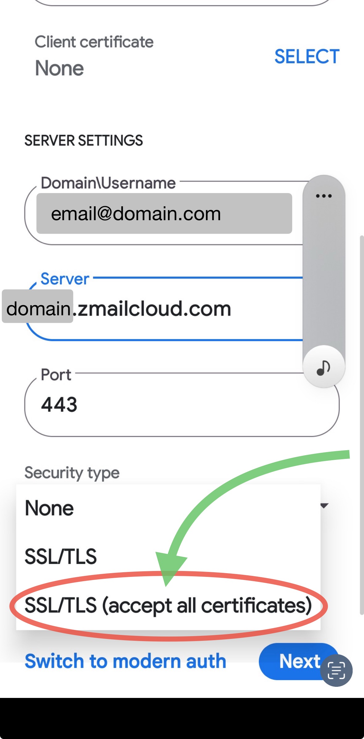 • Domain/username: just your full zMailCloud email address (no "\" , remove the slash if you can)